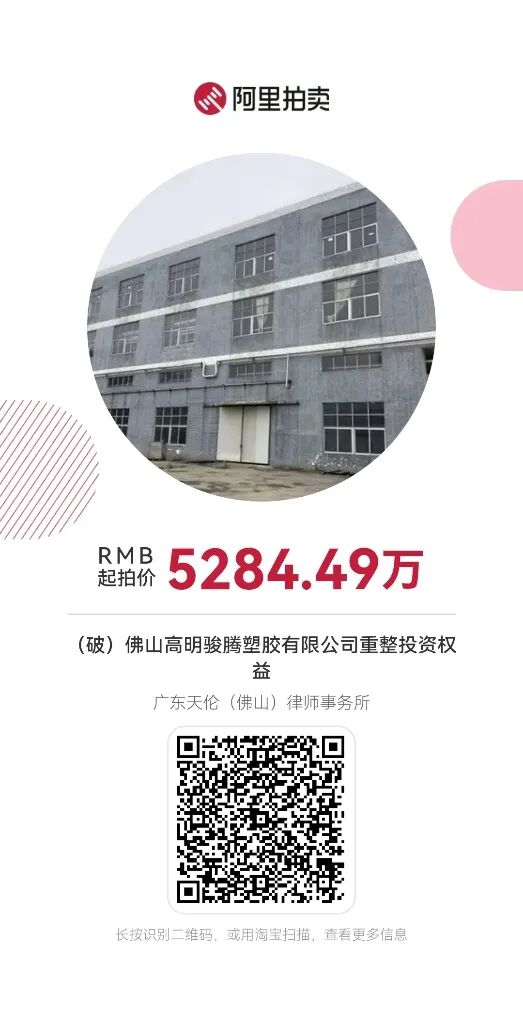 如需了解更多挂拍信息请直接登录阿里拍卖平台破产资产处置频道搜索“佛山高明骏腾塑胶有限公司”或致电联系人:广东天伦(佛山)律师事务所黄律师13302809226(微信同号),谢谢!